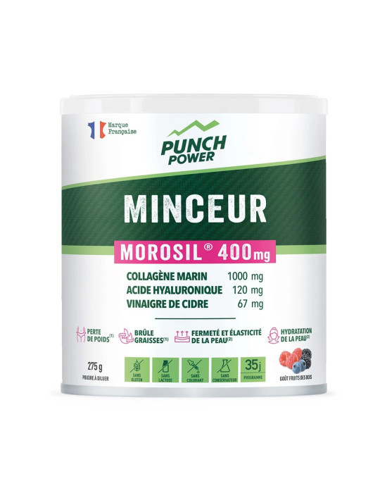 Le Complexe Minceur Morosil (275g) de Punch Power est une formule en poudre saveur fruits des bois, conçue pour t’accompagner dans tes objectifs de perte de graisse, de détox et de soutien cutané. Grâce à une synergie d’actifs innovants et naturels, cette solution agit à plusieurs niveaux pour t’aider à retrouver une silhouette affinée, une peau plus lumineuse, et un organisme rééquilibré.