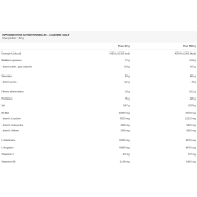 Ingrédients (Chocolat) : maltodextrine, concentré de protéine de lactosérum (lait) (émulsifiant : lécithine de soja), cacao en poudre réduit en matières grasses (4%), poudre d’acides aminés à chaîne ramifiée instantanée (BCAA) 2:1:1, hydrolysat de protéine de lactosérum (lait), isolat de protéine de lactosérum (lait) (émulsifiant : lécithine de soja), arôme, L-glutamine, L-arginine, L-leucine, lécithine de tournesol en poudre, bêta-cyclodextrine, sel, épaississant (gomme xanthane), édulcorants (sucralose, glycosides de stéviol), vitamine C (acide ascorbique), vitamine B6 (chlorhydrate de pyridoxine).