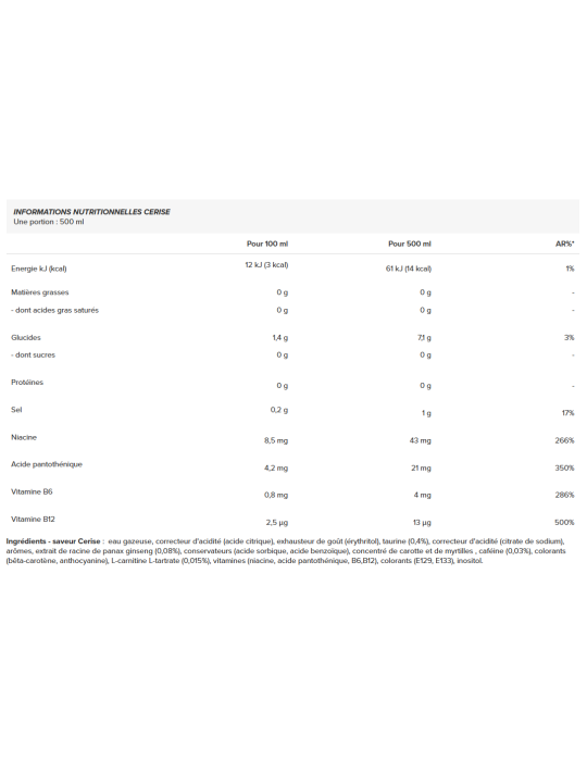 Ingrédients - saveur Cerise : eau gazeuse, correcteur d'acidité (acide citrique), exhausteur de goût (érythritol), taurine (0,4%), correcteur d'acidité (citrate de sodium), arômes, extrait de racine de panax ginseng (0,08%), conservateurs (acide sorbique, acide benzoïque), concentré de carotte et de myrtilles , caféine (0,03%), colorants (bêta-carotène, anthocyanine), L-carnitine L-tartrate (0,015%), vitamines (niacine, acide pantothénique, B6,B12), colorants (E129, E133), inositol.