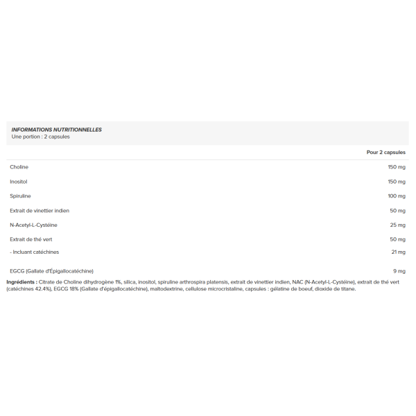 Ingrédients : Citrate de Choline dihydrogène 1%, silica, inositol, spiruline arthrospira platensis, extrait de vinettier indien, NAC (N-Acetyl-L-Cystéine), extrait de thé vert (catéchines 42.4%), EGCG 18% (Gallate d'épigallocatéchine), maltodextrine, cellulose microcristaline, capsules : gélatine de boeuf, dioxide de titane.