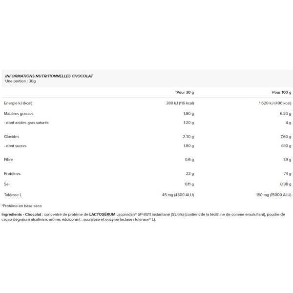 Ingrédients - Chocolat : concentré de protéine de LACTOSÉRUM Lacprodan® SP-8011 instantané (93,6%) (contient de la lécithine de comme émulsifiant), poudre de cacao dégraissé alcalinisé, arôme, édulcorant : sucralose et enzyme lactase (Tolerase® L).