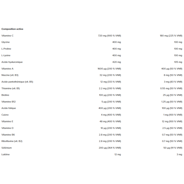 Ingrédients : collagène hydrolysé 80 %, agent de charge (polydextrose), arômes, acidifiant (acide citrique), poudre de cartilage hydrolysé ChondrActiv® 2 %, concentré de betterave en poudre [maltodextrine, concentré de betterave, acidifiant (acide citrique)], colorants (carotènes, complexes de cuivre de chlorophylles et de chlorophyllines), vitamine C (acide L-ascorbique), chlorhydrate de L-lysine 0,5 %, acide hyaluronique 0,4 %, glycine 0,4 %, L-proline 0,4 %, agent anti-agglomérant (dioxyde de silicium), édulcorant (sucralose), lutéine (à partir d’extrait de fleurs de Calendula officinalis), bisglycinate de zinc, sel de table, préparation à base de vitamine E [acétate de DL-alpha-tocophéryl, agent anti-agglomérant (dioxyde de silicium)], sélénite de sodium, niacine (acide nicotinique), gluconate de cuivre, préparation à base de vitamine A [agent stabilisant (gomme arabique), acétate de rétinol, antioxydants (alpha-tocophérol), agent anti-agglomérant (phosphates de calcium)], acide pantothénique (D-pantothénate de calcium), vitamine D (cholécalciférol), acide folique (acide ptéroïlmonoglutamique), vitamine B6 (chlorhydrate de pyridoxine), préparation à base de vitamine B2 [riboflavine, agent de charge (hydroxypropylméthylcellulose)], vitamine B1 (mononitrate de thiamine), vitamine B12 (cyanocobalamine), biotine (D-biotine).