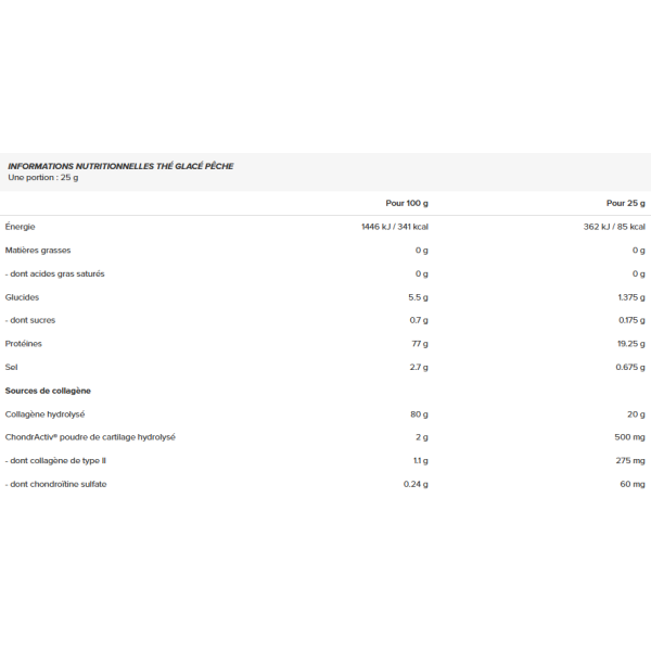 | - dont collagène de type II | 1.1 g | 275 mg |