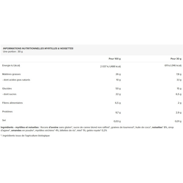 Ingrédients - myrtilles et noisettes : flocons d'avoine sans gluten*, sucre de canne blond non raffiné*, graines de tournesol*, huile de coco*, noisettes* 8%, sirop d'agave*, amandes en poudre*, myrtilles séchées* 4%, billettes de riz*, miel* 1%, gelée royale* 0,2%