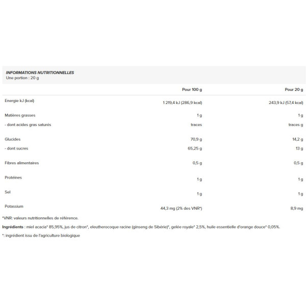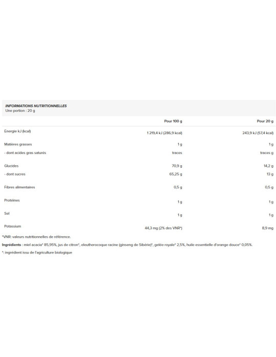 Ingrédients : miel acacia* 85,95%, jus de citron*, eleutherocoque racine (ginseng de Sibérie)*, gelée royale* 2,5%, huile essentielle d'orange douce* 0,05%.