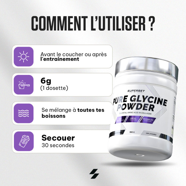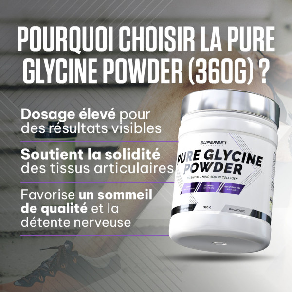 Développée par la marque française Superset Nutrition, la Pure Glycine Powder (360g) se distingue par sa formule 100 % glycine, sans arôme, sans additif et sans sucre. Naturelle, essentielle et efficace, la glycine agit sur tes muscles, tes articulations et donc, ta récupération globale :