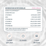 Le Complexe Peau associe 8 actifs essentiels, dont l’acide hyaluronique et la coenzyme Q10, pour accompagner la peau de l’intérieur. Une formule complète pensée pour soutenir l’hydratation, la fermeté et la protection cutanée, tout en aidant à préserver la vitalité et la qualité de la peau jour après jour.