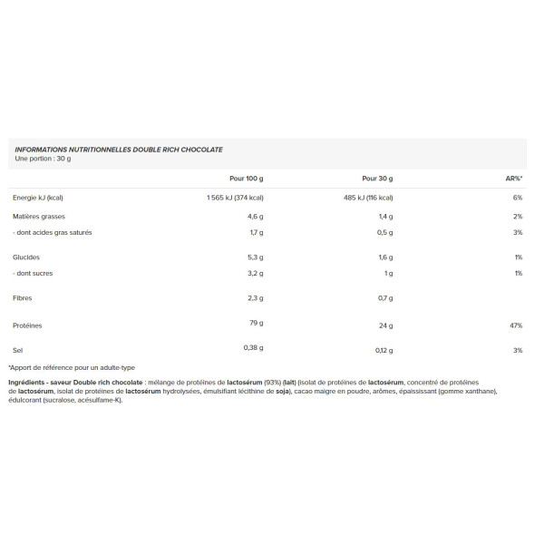 Ingrédients - saveur Double rich chocolate : mélange de protéines de lactosérum (93%) (lait) (isolat de protéines de lactosérum, concentré de protéines de lactosérum, isolat de protéines de lactosérum hydrolysées, émulsifiant lécithine de soja), cacao maigre en poudre, arômes, épaississant (gomme xanthane), édulcorant (sucralose, acésulfame-K).