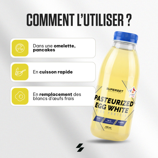 Ingrédients : blanc d’ŒUFS liquide pasteurisé, provenant de poules élevées au sol. Sans colorants, sans conservateurs.