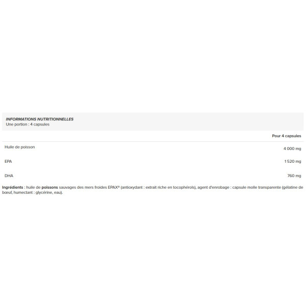 Ingrédients : huile de poissons sauvages des mers froides EPAX® (antioxydant : extrait riche en tocophérols), agent d'enrobage : capsule molle transparente (gélatine de bœuf, humectant : glycérine, eau).
