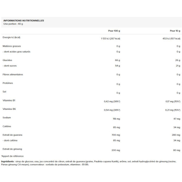 Ingrédients : sirop de glucose, eau, jus concentré de citron, extrait de guarana (graine, Paulinia cupana Kunth), arôme, sel, extrait hydroglycériné de ginseng (racine, Panax ginseng CA meyer), conservateur : sorbate de potassium, vitamines : B1-B6.