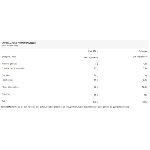 Ingrédients : farine de blé dur, fibres de blé, gluten, isolat de protéines de soja, psyllium, isolat de protéines de pois, gomme de guar (épaississant).