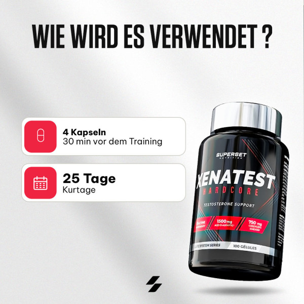 Nehmen Sie 4 Kapseln pro Tag mit einem großen Glas Wasser ein, am besten 30 Minuten vor dem Training oder zwischen den Mahlzeiten an trainingsfreien Tagen.