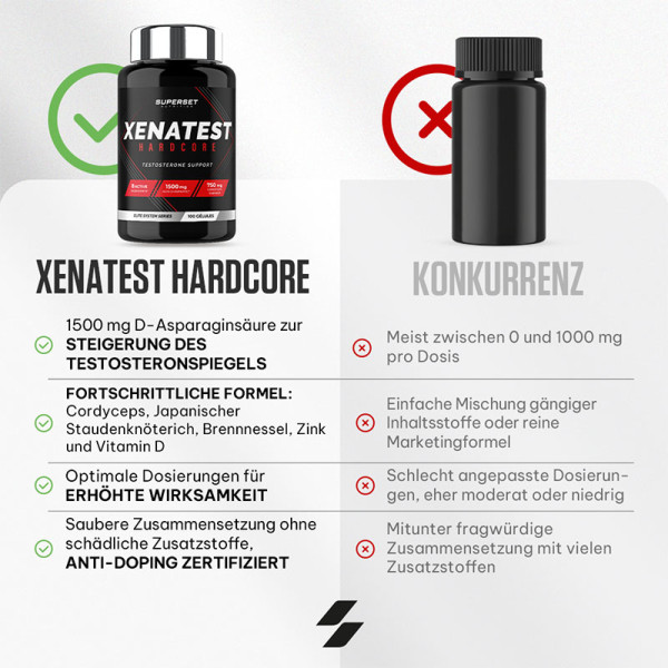 Zutaten: D-Asparaginsäure, Extrakt aus Cordyceps sinensis, Extrakt aus Japanischem Knöterich(Polygonum cuspidatum), dosiert mit Resveratrol, Extrakt aus Brennnesselblättern(Urtica dioica), Zinksulfat, Borsäure, Kupfergluconat, Antiklumpmittel (Magnesiumstearat), Cholecalciferol, Rindergelatine.