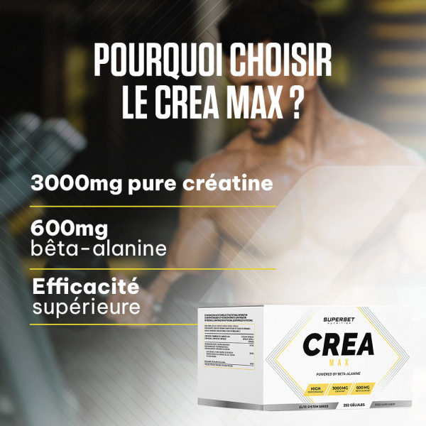 Entscheide dich für CREA MAX (252 CAPS) von Superset Nutritiondiese leistungsstarke Formel kombiniert 3000 mg Kreatin und 600 mg Beta-Alanin pro Dosis, um deine Leistung zu steigern!