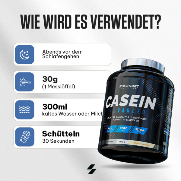 | Proteine - davon Milcheiweißkonzentrat - davon Calciumcaseinat - davon mizellares Kasein | 22 g 38% 36% 7,3% | 45% - - - | 75 g 38% 36% 7,3% | 150% - - - |