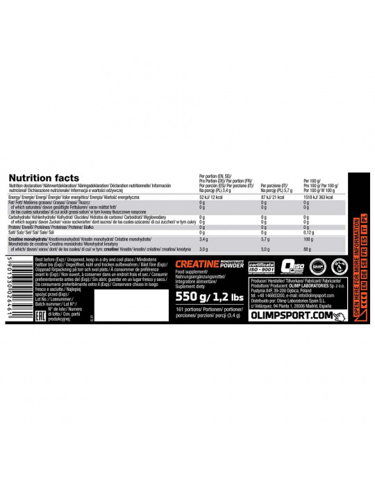 Creatin Powder von Olimp ist ein hochgradig mikronisiertes Creatinpulver. Mikronisiertes Kreatin ist eigentlich ein Kreatin, bei dem durch die Mikronisierung die Partikelgröße verringert wurde, wodurch die Löslichkeit des Pulvers erhöht wird. Dieses Kreatinmonohydrat wird daher vom Körper besser aufgenommen und verdaut.