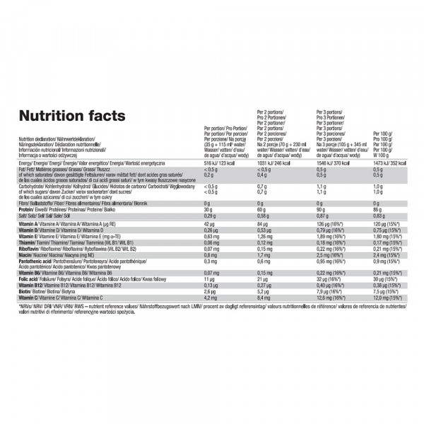 Zutaten: 97,5% Molkenproteinisolat (aus Milch), Aromen, Säureregulator - Apfelsäure, Zitronensäure, Verdickungsmittel - Xanthangummi, Gummi arabicum, Natriumcarboxymethylcellulose, Süßungsmittel - Acesulfam K, Sucralose, Salz, 0,03% Vitamine (L-Ascorbinsäure - Vit. C, DL-alpha-Tocopherol-Acetat - Vit. E, Nicotinamid - Niacin, D-Biotin, Retinolacetat - Vit. A, Calcium-D-Pantothenat - Pantothensäure, Pyridoxinhydrochlorid - Vit. B6, Cholecalciferol - Vit. D, Pteroylmonoglutaminsäure - Folsäure, Thiaminmononitrat - Vit. B1, Riboflavin - Vit. B2, Cyanocobalamin - Vit. B12), Emulgator - Lecithin (aus Soja), Farbstoffe: Karmin (PARFUM ERFRISCH), E 150c (PARFUM SCHOKOLADE).