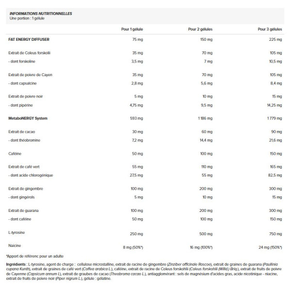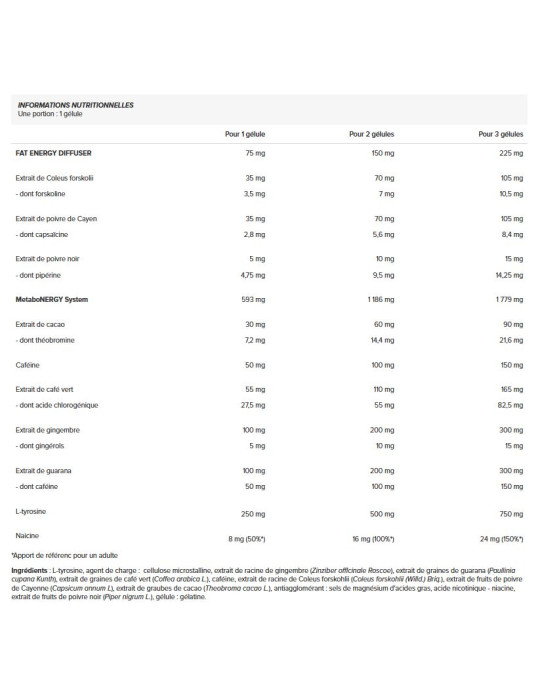 Zutaten: L-Tyrosin, Füllstoff: mikrokristalline Cellulose, Ingwerwurzelextrakt(Zinziber officinale Roscoe), Guaranasamenextrakt(Paullinia cupana Kunth), Extrakt aus grünen Kaffeesamen(Coffea arabica L.), Koffein, Coleus forskohlii Wurzelextrakt(Coleus forskohlii (Willd.) Briq.), Cayennepfefferfruchtextrakt(Capsicum annum L.), Kakaobohnenextrakt(Theobroma cacao L.), Trennmittel: Magnesiumsalze von Speisefettsäuren, Nicotinsäure - Niacin, Schwarzer Pfefferfruchtextrakt(Piper nigrum L.), Kapsel: Gelatine.