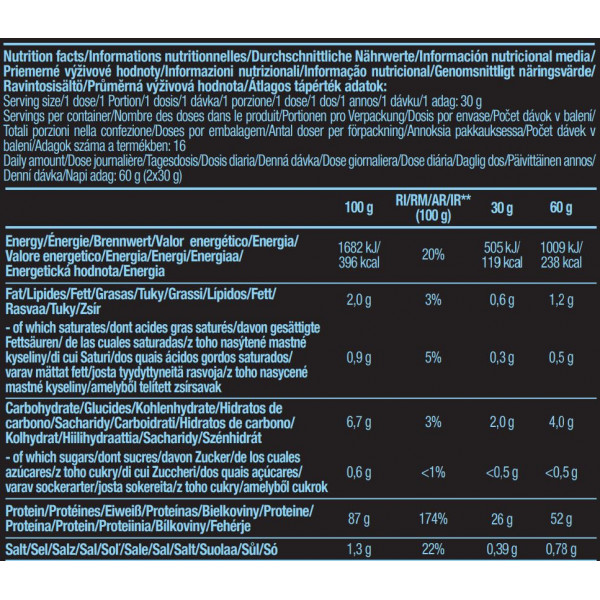 Zutaten Erdbeere: Hydrolysierte Proteine 78%, Geschmacksverstärker (Glycin und sein Natriumsalz), L-Glutamin 4%, L-Arginin 3%, Aromen, Maltodextrin, Verdickungsmittel (Zellulosegummi, Carrageen), Emulgator: Lecithine (Soja), Säuerungsmittel (Zitronensäure), Süßungsmittel (Sucralose), Salz, Farbstoff (Allura-Rot*)