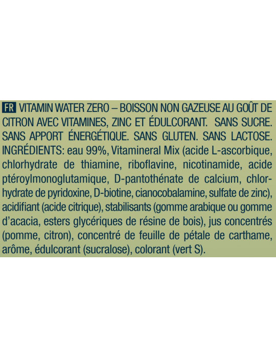Ohne Energiezufuhr ergänzt dieses Produkt mit seinen 9 Vitaminen deine tägliche Vitaminzufuhr und du findest auch eine Zinkzufuhr. Vitamin water zero (500 ml) enthält physiologisch wichtige wasserlösliche Vitamine wie Vitamin C und alle Vitamine der B-Gruppe, die am Energiestoffwechsel beteiligt sind, aber auch zur normalen Funktion des Immunsystems, des Nervensystems und zur Verringerung von Müdigkeit beitragen.