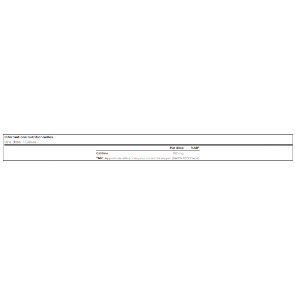 Net weight : 50 gNehmen Sie 1 Kapsel pro Tag, 30 Minuten bis 1 Stunde vor der sportlichen Aktivität. Koffein hilft, die Konzentrationsfähigkeit zu verbessern.