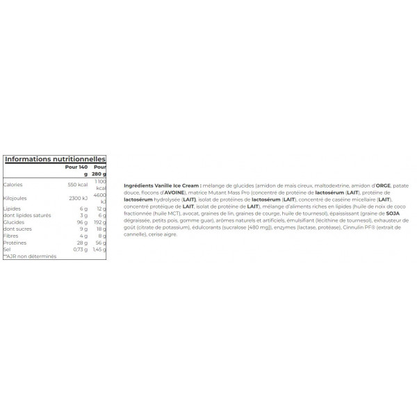 Zutaten Vanille-Eiscreme :mischung aus Kohlenhydraten (Wachsmaisstärke, Maltodextrin, Maisstärke, Weizenstärke)ORGESüßkartoffel, GetreideflockenAVOINE), Matrix Mutant Mass Pro (Proteinkonzentrat aus molke (MILCH), Protein von molke hydrolysiert (MILCH), proteinisolat aus molke (MILCH), mizellares Kaseinkonzentrat (MILCH), Proteinkonzentrat von MILCHProteinisolat aus MILCH), Mischung aus lipidreichen Lebensmitteln (fraktioniertes Kokosnussöl (MCT-Öl), Avocado, Leinsamen, Kürbiskerne, Sonnenblumenöl), Verdickungsmittel (Leinsamen, Kürbiskerne, Sonnenblumenöl), Fett (Leinsamen, Leinsamen, Kürbiskerne, Sonnenblumenöl) SOJA entfettet, Erbsen, Guargummi), natürliche und künstliche Aromen, Emulgator (Sonnenblumenlecithin), Geschmacksverstärker (Kaliumcitrat), Süßstoffe (Sucralose[480 mg]), Enzyme (Laktase, Protease), Cinnulin PF® (Zimtextrakt), Sauerkirsche.