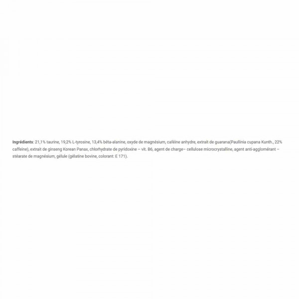 Zutaten: 21,1% Taurin, 19,2% L-Tyrosin, 13,4% Beta-Alanin, Magnesiumoxid, wasserfreies Koffein, Guarana-Extrakt (Paullinia cupana Kunth., 22% Koffein), Ginseng-Extrakt Korean Panax, Pyridoxin-Hydrochlorid - Vit. B6, Füllstoff - mikrokristalline Zellulose, Antiklumpmittel - Magnesiumstearat, Kapsel (Rindergelatine, Farbstoff: E 171).