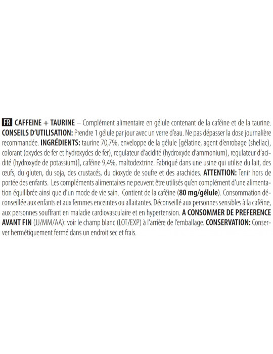 Zutaten: Taurin 70,7%, Kapselhülle [gélatine, agent d'enrobage (shellac), colorant (oxydes de fer et hydroxydes de fer), régulateur d'acidité (hydroxyde d'ammonium), régulateur d'acidité (hydroxyde de potassium)], Koffein 9,4%, Maltodextrin.
