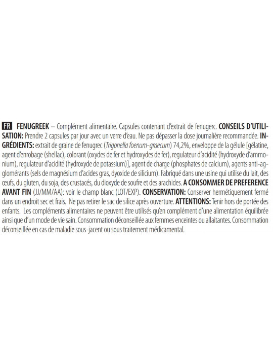 Zutaten: Bockshornkleesamen-Extrakt (Trigonella foenum-graecum) 74,2%, Kapselhülle [gélatine, agent d’enrobage (shellac), colorant (oxydes de fer et hydroxydes de fer), régulateur d’acidité (hydroxyde d’ammonium), régulateur d’acidité (hydroxyde de potassium)], Füllstoff (Calciumphosphate), Trennmittel (Magnesiumsalze von Speisefettsäuren, Siliciumdioxid).