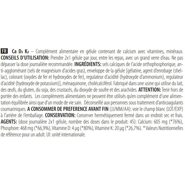 Zutaten: Calciumsalze der Orthophosphorsäure, Antiklumpmittel (Magnesiumsalze von Speisefettsäuren), Kapselhülle [gélatine, agent d’enrobage (shellac), colorant (oxydes de fer et hydroxydes de fer), régulateur d’acidité (hydroxyde d’ammonium), régulateur d’acidité (hydroxyde de potassium)], Menachinon, Cholecalciferol.
