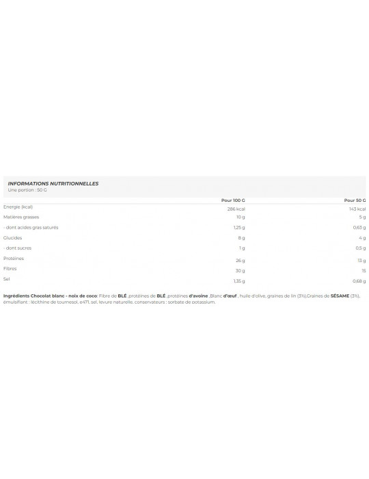 Zutaten Weiße Schokolade - Kokosnuss: Weizenfaser, Weizenprotein, Haferprotein, Eiweiß , Olivenöl, Leinsamen (3%), Sesamsaat (3%), Emulgator: Sonnenblumenlecithin, e471, Salz, natürliche Hefe, Konservierungsmittel: Kaliumsorbat.