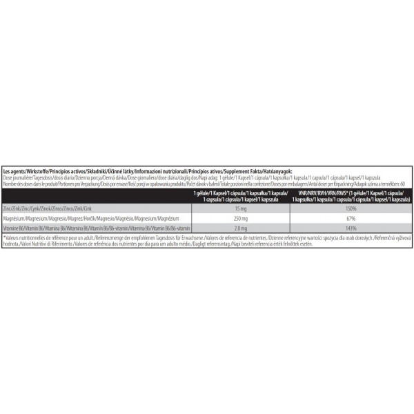 Zutaten: Füllstoff (Calciumphosphate), Magnesiumoxid, Kapselhülle [gélatine, agent d'enrobage (shellac), colorant (oxydes de fer et hydroxydes de fer), régulateur d'acidité (hydroxyde d'ammonium), régulateur d'acidité (hydroxyde de potassium)], Zinkgluconat, Trennmittel (Siliciumdioxid), Pyridoxinhydrochlorid.