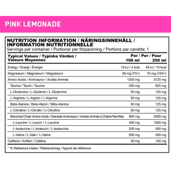 Zutaten Pink Lemonade: wasser, verzweigtkettige Aminosäuren (L-Leucin, L-Isoleucin, L-Valin), Kohlensäure, Säure (Zitronensäure), Magnesiumlaktat, Taurin, Aromastoffe, Säureregulator (Kaliumcitrate), beta-Alanin, L-Citrullin, L-Glutamin, L-Arginin, L-Tyrosin, natürliches Koffein, Süßstoffe (Sucralose, Acesulfame-K), schwarzes Karottenkonzentrat, Grüntee-Extrakt (Camellia sinensis, Blatt).