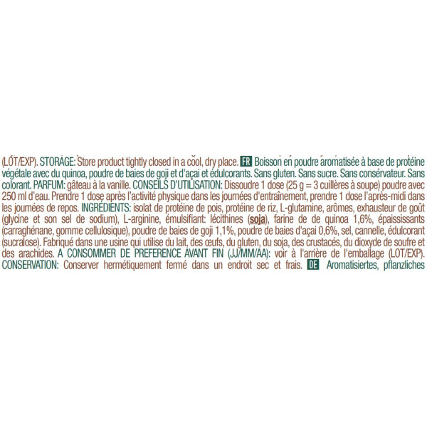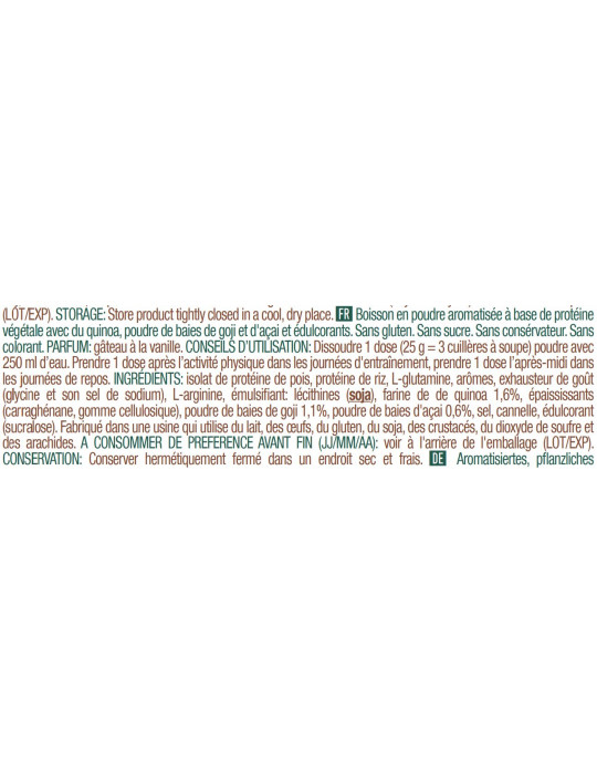 Zutaten Vanille Cookie: Erbsenproteinisolat, Reisprotein, L-Glutamin, Aromastoffe, Geschmacksverstärker (Glycin und sein Natriumsalz), L-Arginin, Emulgator: Lecithine(Soja), Quinoamehl 1,6%, Verdickungsmittel (Carrageen, Zellulosegummi), Gojibeerenpulver 1,1%, Acaibeerenpulver 0,6%, Salz, Zimt, Süßungsmittel (Sucralose).