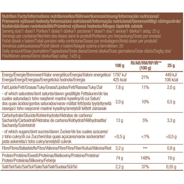 Zutaten Haselnuss: Erbsenproteinisolat, Reisprotein, L-Glutamin, mageres Kakaopulver, Geschmacksverstärker (Glycin und sein Natriumsalz), L-Arginin, Emulgator: Lecithine(Soja), Quinoamehl 1,6%, Verdickungsmittel (Carrageen, Zellulosegummi), Aromen, Gojibeerenpulver 1,1%, Acaibeerenpulver 0,6%, Salz, Süßungsmittel (Sucralose).
