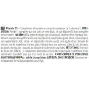 Zutaten: Füllstoff (Zellulosegel), Cholecalciferol, Überzugsmittel [stabilisants (copolymère greffé d’alcool polyvinylique et de polyéthylèneglycol, alcool polyvinylique), anti-agglomérants (talc, mono- et diglycérides d’acides gras)], Trennmittel (Siliciumdioxid, Magnesiumsalze von Speisefettsäuren).