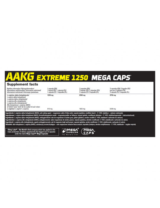 Aakg 1250 extreme (120 Kapseln) ist ein Nahrungsergänzungsmittel der Marke Olimp Sport Nutrition auf der Basis von L-Arginin in Form von Arginin-Alpha-Ketoglutarat (AAKG).