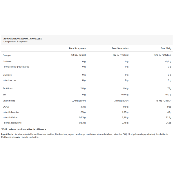 Zutaten: Freie Aminosäuren (l-Leucin, l-Valin, l-Isoleucin), Füllstoff - mikrokristalline Zellulose; Vitamin B6 (Pyridoxinhydrochlorid), Emulgator - Lecithine (aus Soja); Kapsel - Gelatine.