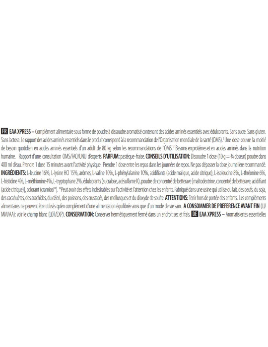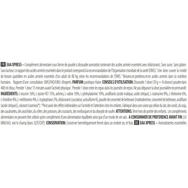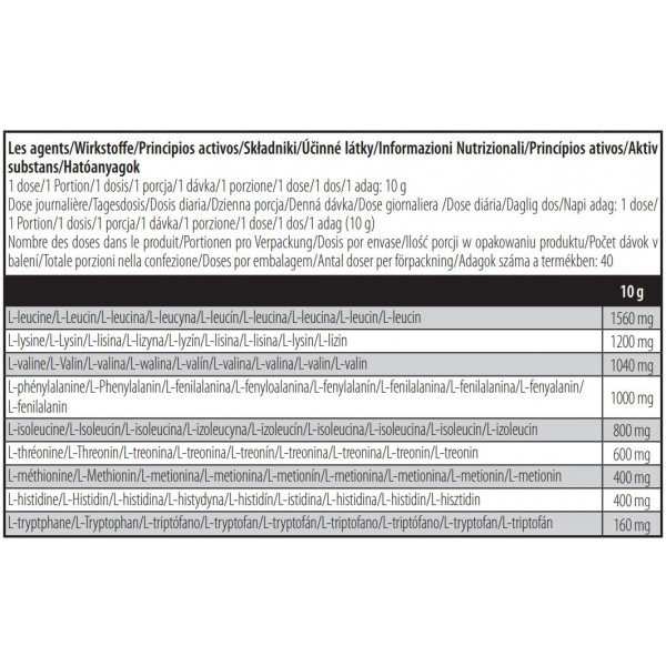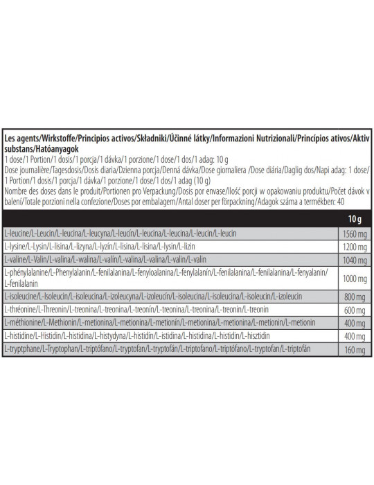 Tropische Zutaten: L-Leucin 16%, L-Lysin HCl 15%, Aromen, L-Valin 10%, Säuerungsmittel (Apfelsäure, Zitronensäure), L-Phenylalanin 10%, L-Isoleucin 8%, L-Threonin 6%, L-Histidin 4%, L-Methionin 4%, L-Tryptophan 2%, Süßungsmittel (Sucralose, Acesulfam K), Cayennepfeffer (Capsicum annuum)-Fruchtextraktpulver [Maltodextrine, extrait de poivre, émulsifiant (esters d'acide citrique de mono et diglycérides d'acides gras), humectant (glycérol), antioxydants (esters d'acide gras d'acide ascorbique, alpha-tocophérol)].
