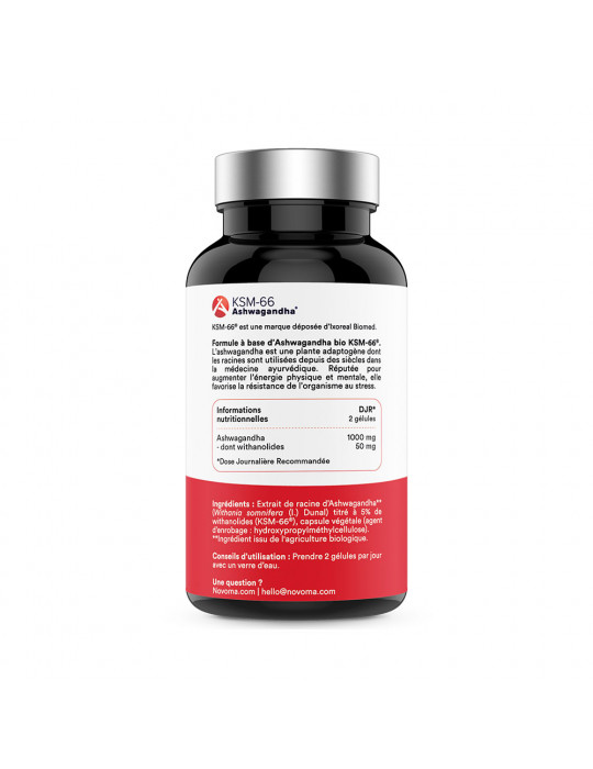 Darüber hinaus ist Ashwagandha von Novoma von Ecocert als Bio zertifiziert, garantiert frei von Hilfsstoffen, in Frankreich hergestellt und vegan.