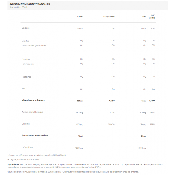Zutaten: Wasser, L-Carnitin (7%), Säuerungsmittel (Zitronensäure), Aroma, Konservierungsmittel (Sorbinsäure, Natriumbenzoat), Calcium-D-Pantothenat, Süßungsmittel (Acesulfam K, Sucralose), Chrom(III)-chlorid (0,2%), Farbstoffe (Tartrazin, Sunset Yellow FCF)*.