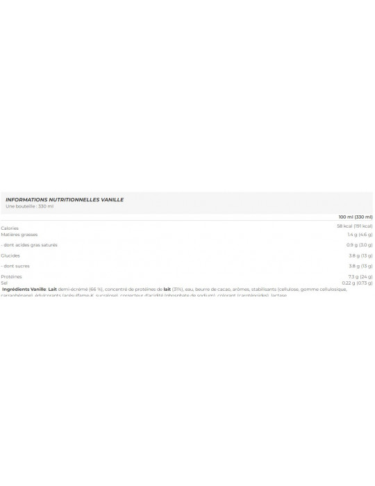 Zutaten Vanille: Halbentrahmte Milch (66 %), Milchproteinkonzentrat (31 %), Wasser, Kakaobutter, Aromen, Stabilisatoren (Zellulose, Zellulosegummi, Carrageen), Süßungsmittel (Acesulfam-K, Sucralose), Säureregulator (Natriumphosphat), Farbstoff (Carotinoide), Laktase.