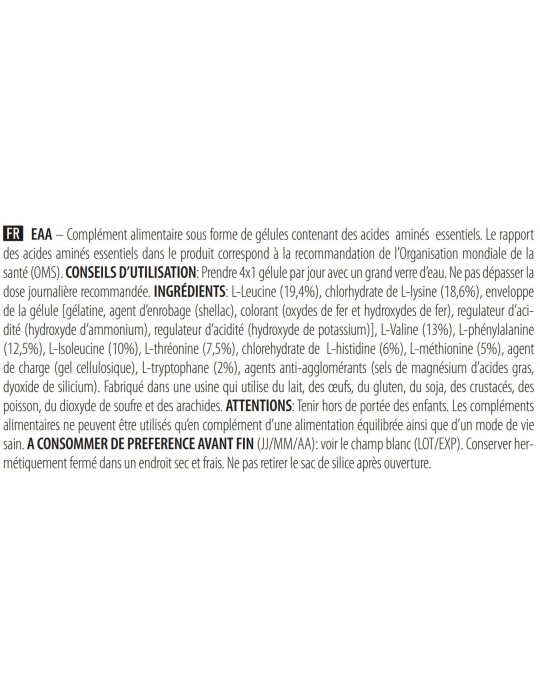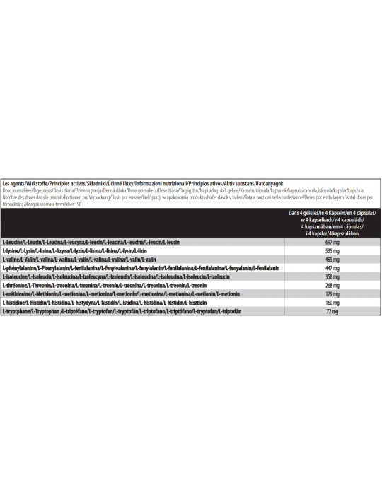 Zutaten: L-Leucin (19,4%), L-Lysinhydrochlorid (18,6%), Kapselhülle [gélatine, agent d’enrobage (shellac), colorant (oxydes de fer et hydroxydes de fer), régulateur d’acidité (hydroxyde d’ammonium), régulateur d’acidité (hydroxyde de potassium)], L-Valin (13%), L-Phenylalanin (12,5%), L-Isoleucin (10%), L-Threonin (7,5%), l-Histidinhydrochlorid (6%), L-Methionin (5%), Füllstoff (Zellulosegel), L-Tryptophan (2%), Trennmittel (Magnesiumsalze von Speisefettsäuren, Siliciumdioxid).
