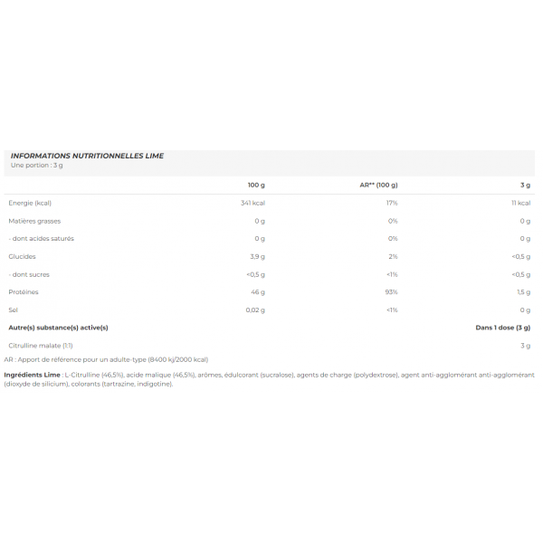 Neutrale Zutaten: L-Citrullin (49,8 %); Apfelsäure (49,8 %); Trennmittel (Siliciumdioxid).