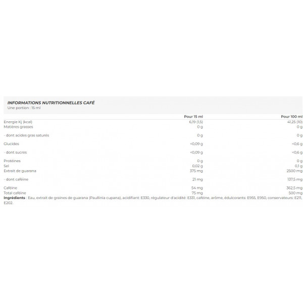 Nahrungsergänzungsmittel sollten als Teil eines gesunden Lebensstils verwendet werden und nicht als Ersatz für eine abwechslungsreiche und ausgewogene Ernährung. Die empfohlene Tagesdosis darf nicht überschritten werden. Nach dem Öffnen im Kühlschrank aufbewahren. Hoher Koffeingehalt (75 mg pro 15 ml). Nicht empfohlen für Kinder, schwangere oder stillende Frauen und Personen, die empfindlich auf Koffein reagieren.