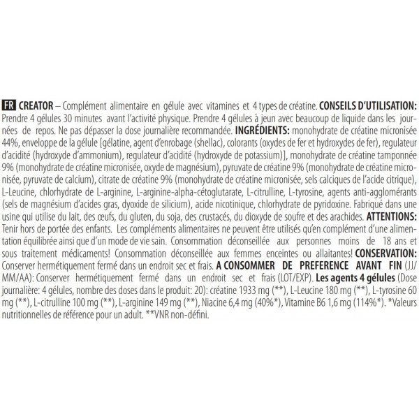 Zutaten: mikronisiertes Kreatinmonohydrat 44%, Kapselhülle [gélatine, agent d’enrobage (shellac), colorants (oxydes de fer et hydroxydes de fer), régulateur d’acidité (hydroxyde d’ammonium), régulateur d’acidité (hydroxyde de potassium)], gepuffertes Kreatinmonohydrat 9% (mikronisiertes Kreatinmonohydrat, Magnesiumoxid), Kreatinpyruvat 9% (mikronisiertes Kreatinmonohydrat, Kalziumpyruvat), Kreatincitrat 9% (mikronisiertes Kreatinmonohydrat, calciumsalze der Zitronensäure), L-Leucin, L-Argininhydrochlorid, L-Arginin-alpha-ketoglutarat, L-Citrullin, L-Tyrosin, Trennmittel (Magnesiumsalze von Speisefettsäuren, Siliciumdioxid), Nikotinsäure, Pyridoxinhydrochlorid.