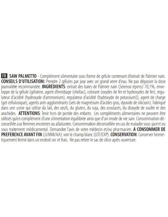 Zutaten: Extrakt aus den Beeren der Sägepalme (Serenoa repens) 70,1%, Kapselhülle [gélatine, agent d’enrobage (shellac), colorant (oxydes de fer et hydroxydes de fer), régulateur d’acidité (hydroxyde d’ammonium), régulateur d’acidité (hydroxyde de potassium)], Füllstoff (Zellulosegel), Trennmittel (Magnesiumsalze von Speisefettsäuren, Siliciumdyoxid).