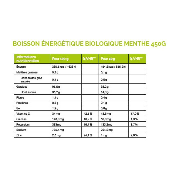 Eine Portion von 40 g Pulver enthält mehr als 38 g Kohlenhydrate, davon 14 g Zucker, was es zu einem ausgezeichneten Energieträger für deinen Körper macht. Vor allem dank des Maltodextrins, des Kokosnusszuckers und des Agavensirups , die die Glykogenauffüllung ermöglichen. Es ist das ideale Getränk für progressive Energie!