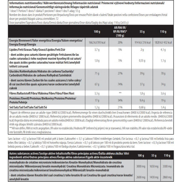 Schließlich kommen noch mikronisiertes Kreatinmonohydrat (1650 mg pro Dosis) und Glutaminpeptide zu dieser ultrakompletten Formel hinzu. Kreatin ist ein Molekül, das die körperliche Leistungsfähigkeit bei kurzzeitigen intensiven Trainingseinheiten verbessert.